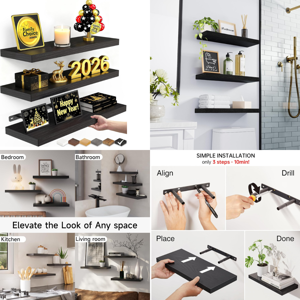Each shelf can hold up to 22 lbs, making them ideal for displaying books, plants, photos, spices, bathroom essentials, or decorative items. Whether you’re organizing your kitchen, bathroom, bedroom, or living room, these floating shelves offer a clean and modern look.